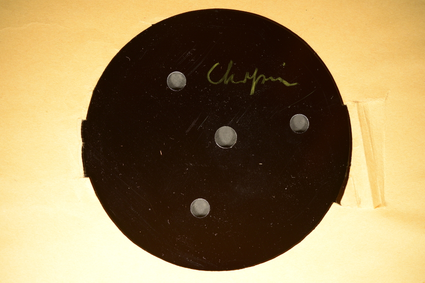 Writing on the jacket lists the composers and works. The disc itself has the composers' names (Bach and Chopin) written in the center, label area of the disc in what looks like yellow grease pencil. (Up close and personal the composers' names do not appear as clearly as in the pictures.)
